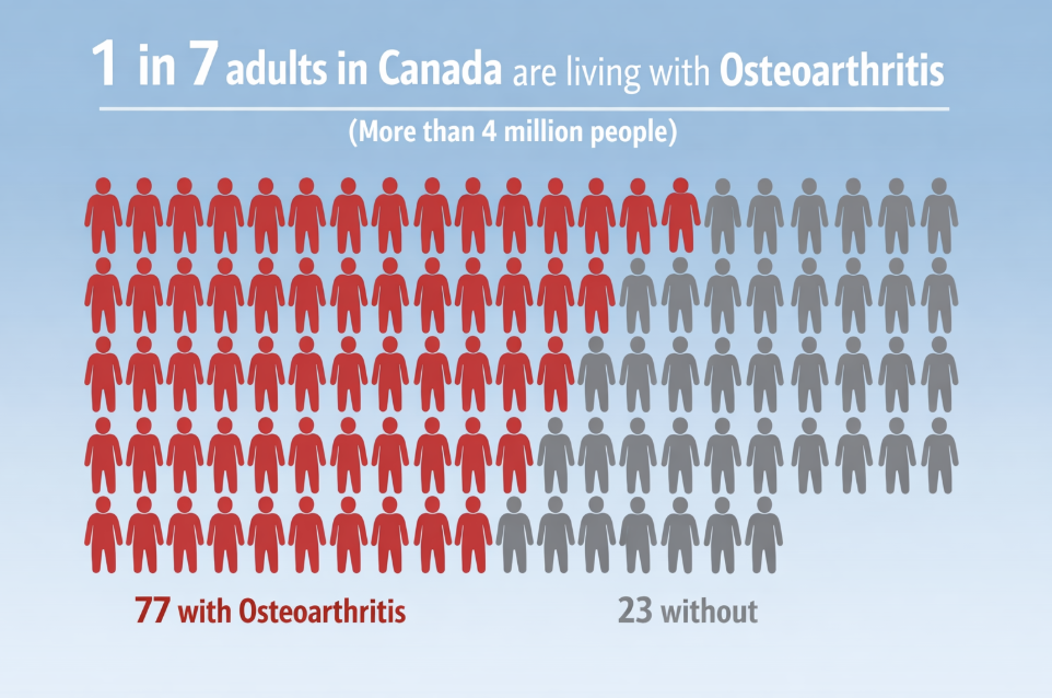 In Canada, an estimated 1 in 7 adults (more than 4 million people) are living with osteoarthritis, and that number is expected to rise significantly over the next decade as the population ages and rates of metabolic disease increase. We are not talking about a niche condition. We’re talking about something that touches nearly every family.