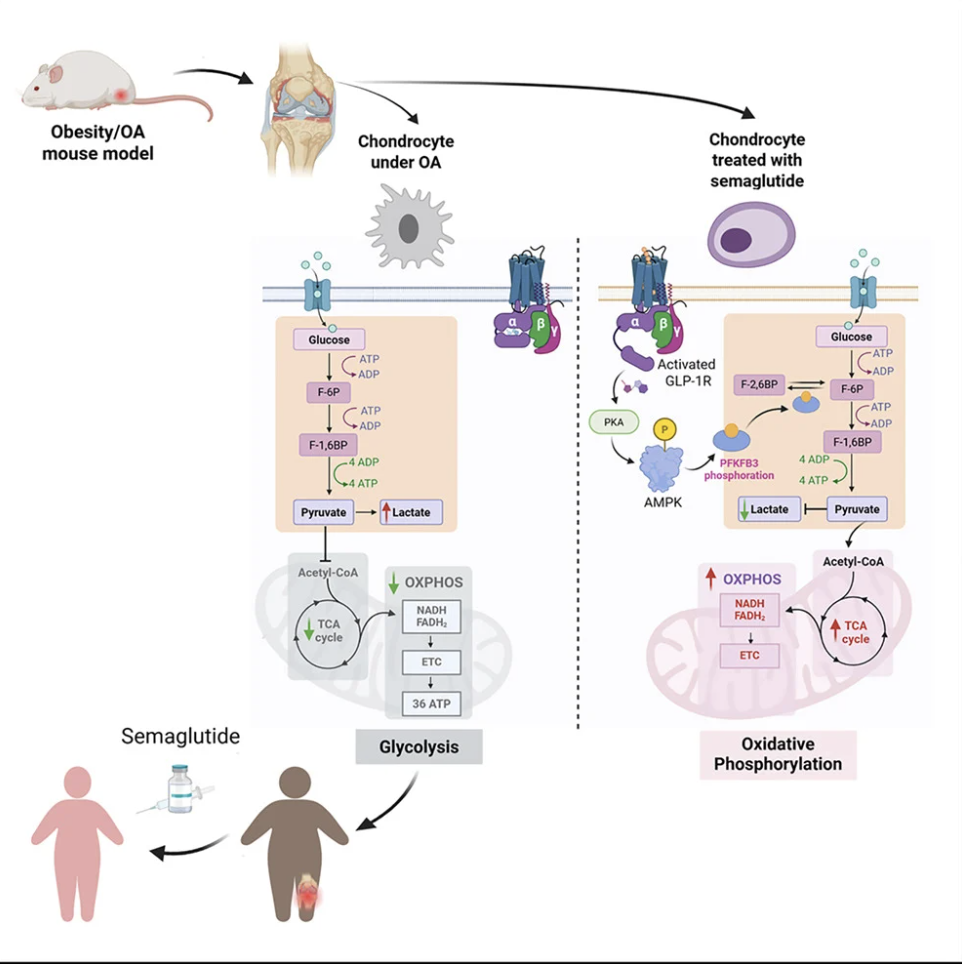 This diagram from Qin et al. 2026 shows that in osteoarthritis, cartilage cells (chondrocytes) tend to run in a stressed, inefficient “low-gear” mode, but when semaglutide is introduced (in a mouse model), those cells shift into a healthier, more efficient energy state.