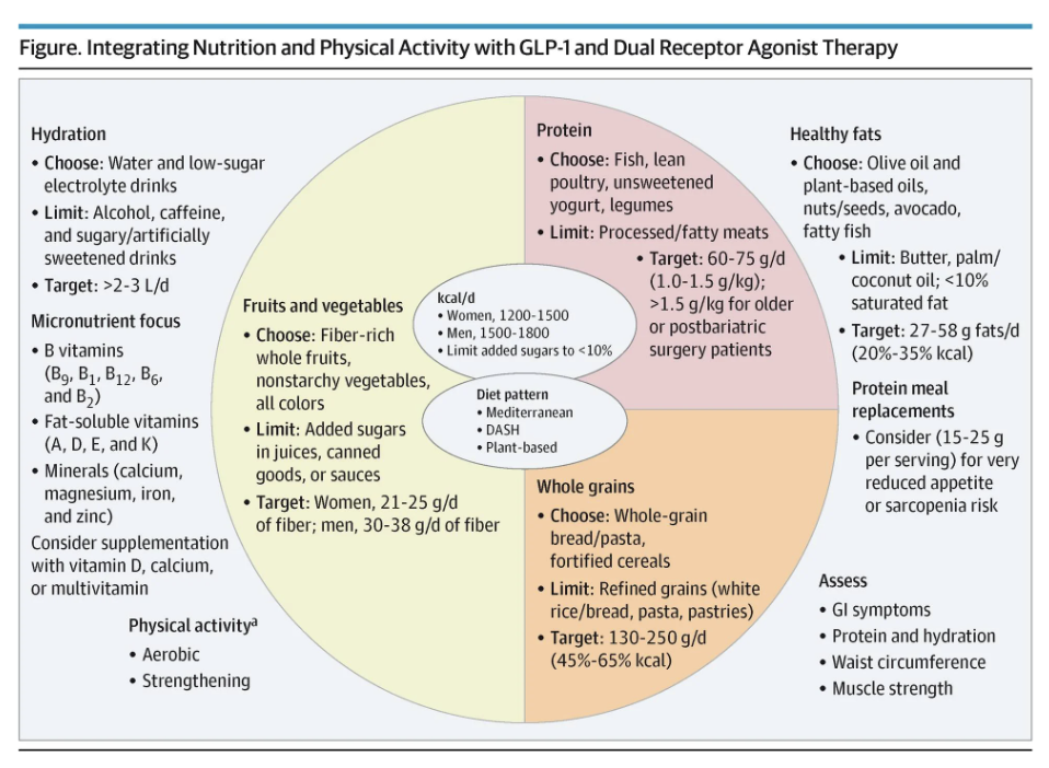 "GLP-1 receptor agonists should be prescribed alongside structured lifestyle interventions—specifically resistance training at least 3 times weekly, 150 minutes of moderate-intensity aerobic exercise weekly, and nutrient-dense dietary counseling—to preserve muscle and bone mass, optimize weight loss, and improve cardiometabolic outcomes."