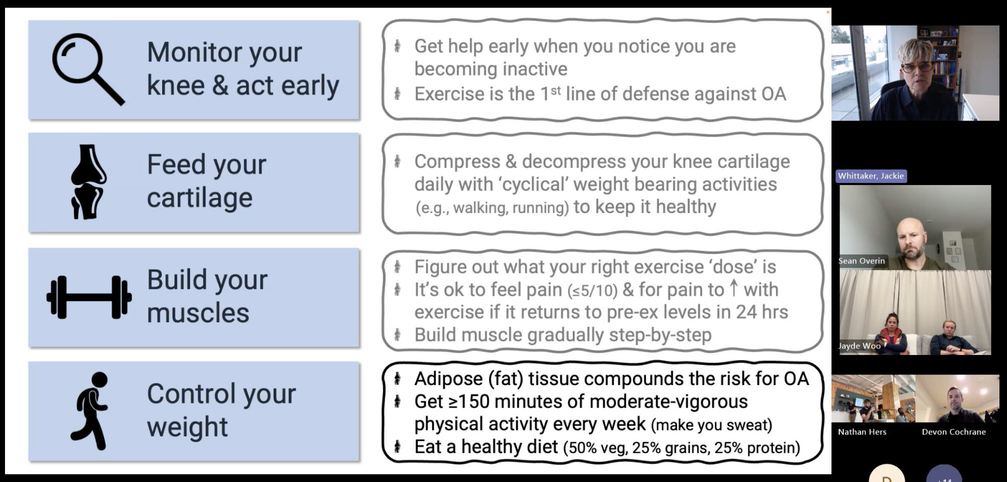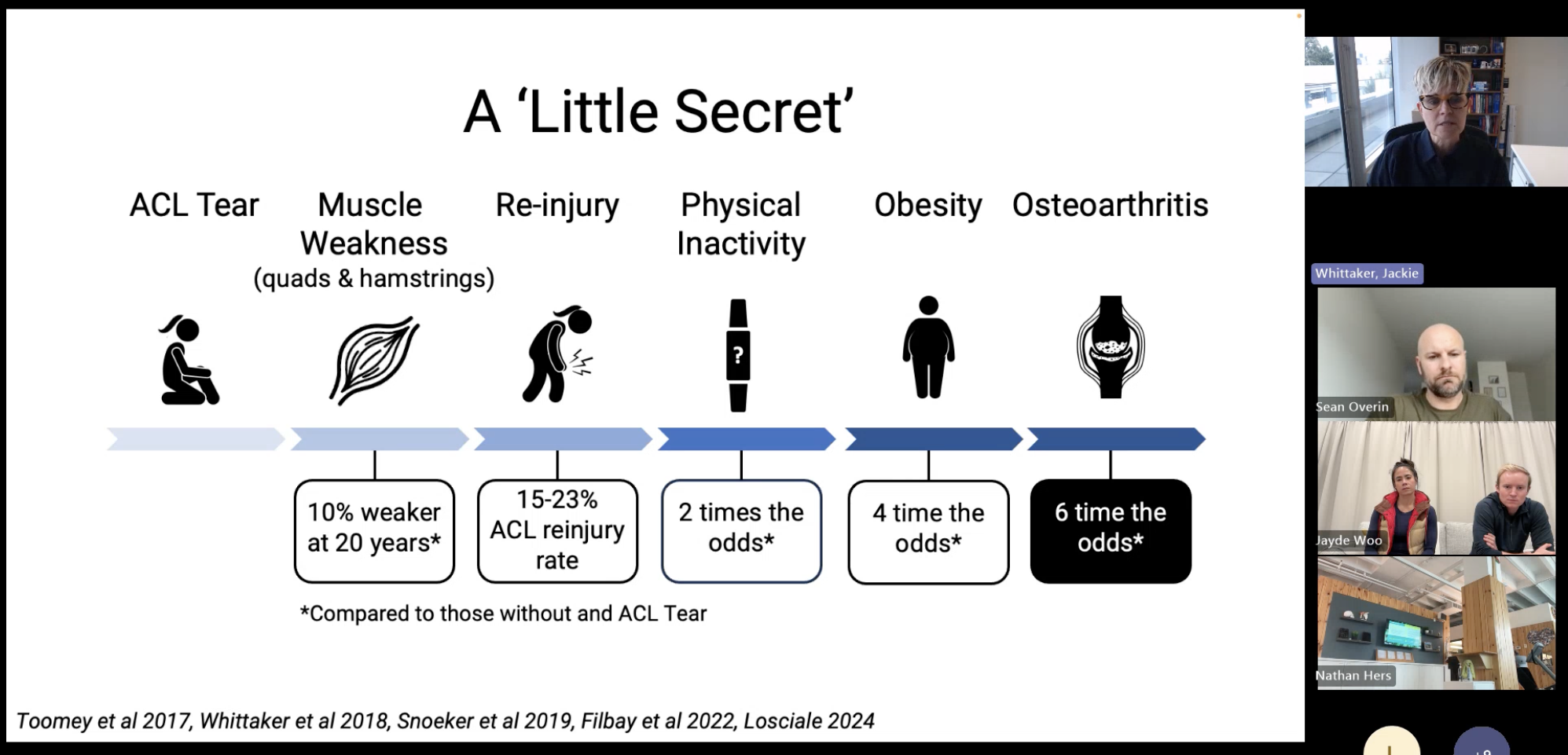 how can we build systems that connect research to proven MSK interventions like SOAR, and link them to public-health structures that fund and sustain care — to prevent downstream health risks and system costs?Great slide from the presentation above: Jackie is getting at how many people believe that if they do their rehab and surgery as prescribed, their knee will recover fully and, to be fair, that’s often what we as healthcare providers imply.