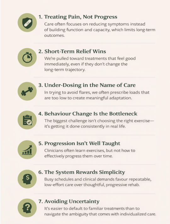 We’ve known this for a while. And yet, adherence remains low. Care can drifts toward passive treatment, under-dosed exercise, and limited progression.